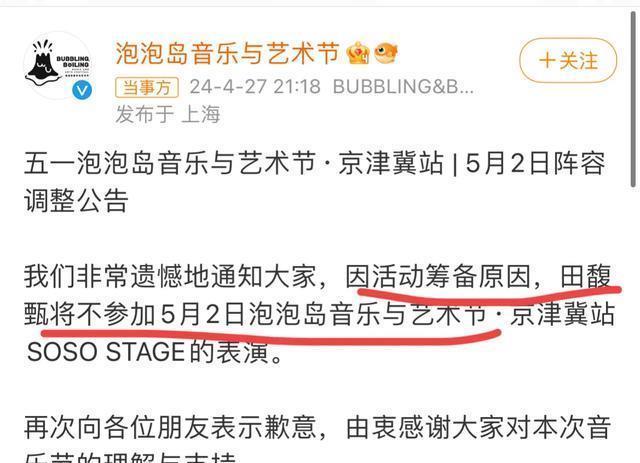 在几天的悲伤下,终于顶不住压力。 泡泡岛刚才官宣“因活动有计划原因,田馥甄将不投入5月2日泡泡岛音乐与艺术节。”